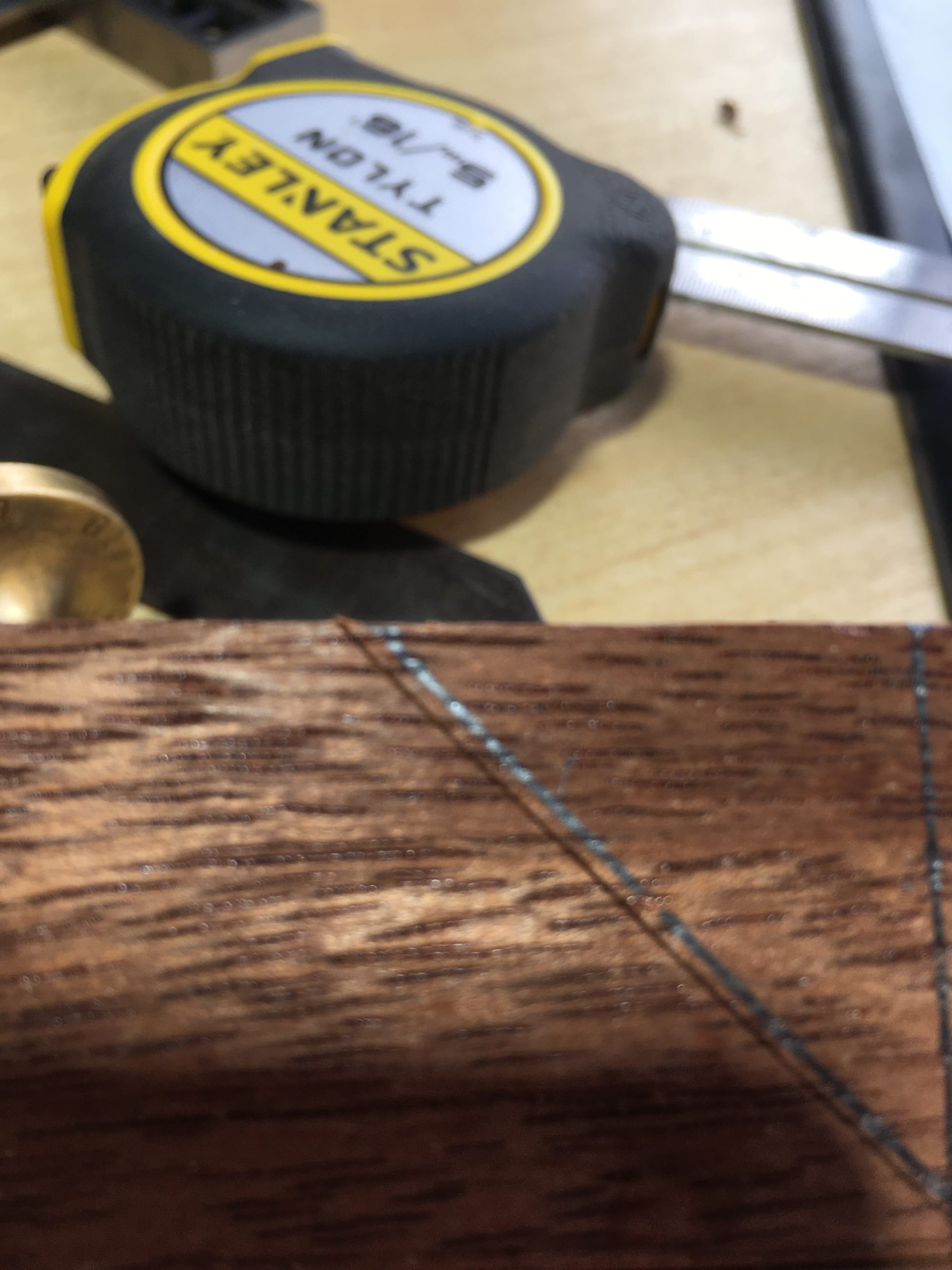 The pencil lines 45 degree. The top knife line is 45.75 off the top line, the bottom is 44.25 off the top line. The other pencil line is for the 1.5d that comes off the top.