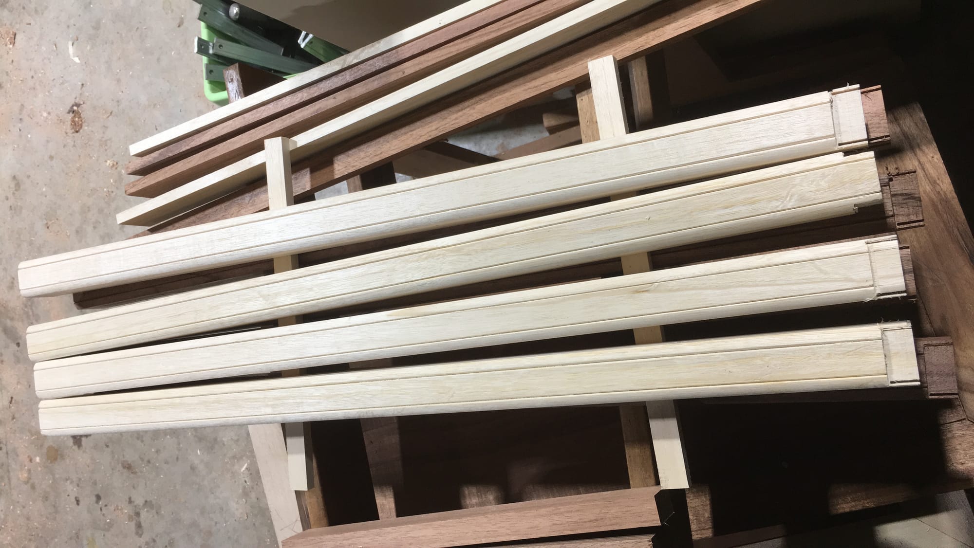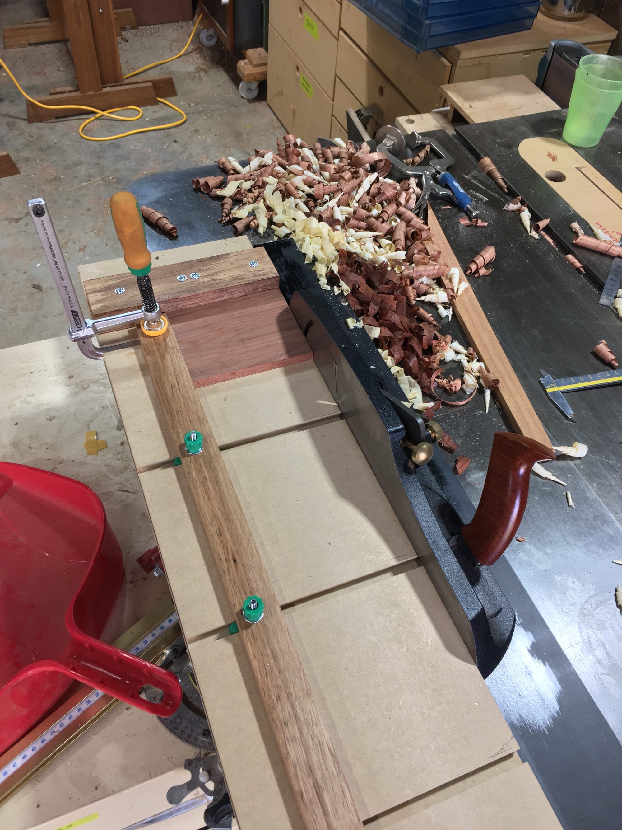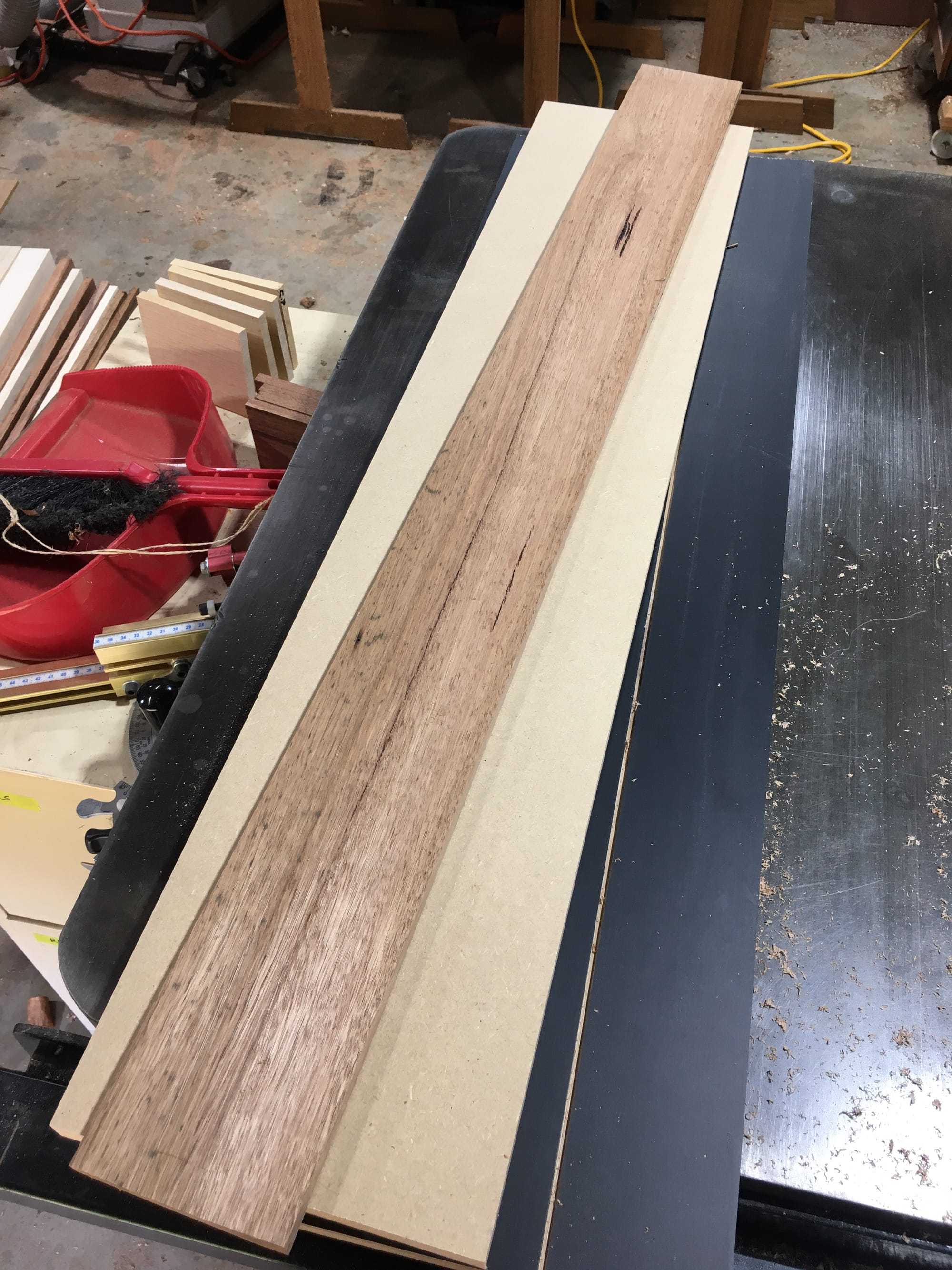 I decided the table saw isn't going to work for the spandrel mitres. Blade run-out will eat a 0.75-degree angle, and free-handing the truing across four spandrels would guarantee they don't match. The exact number - 45.75/44.25 or 45.74/44.26 - matters less than all four being identical.