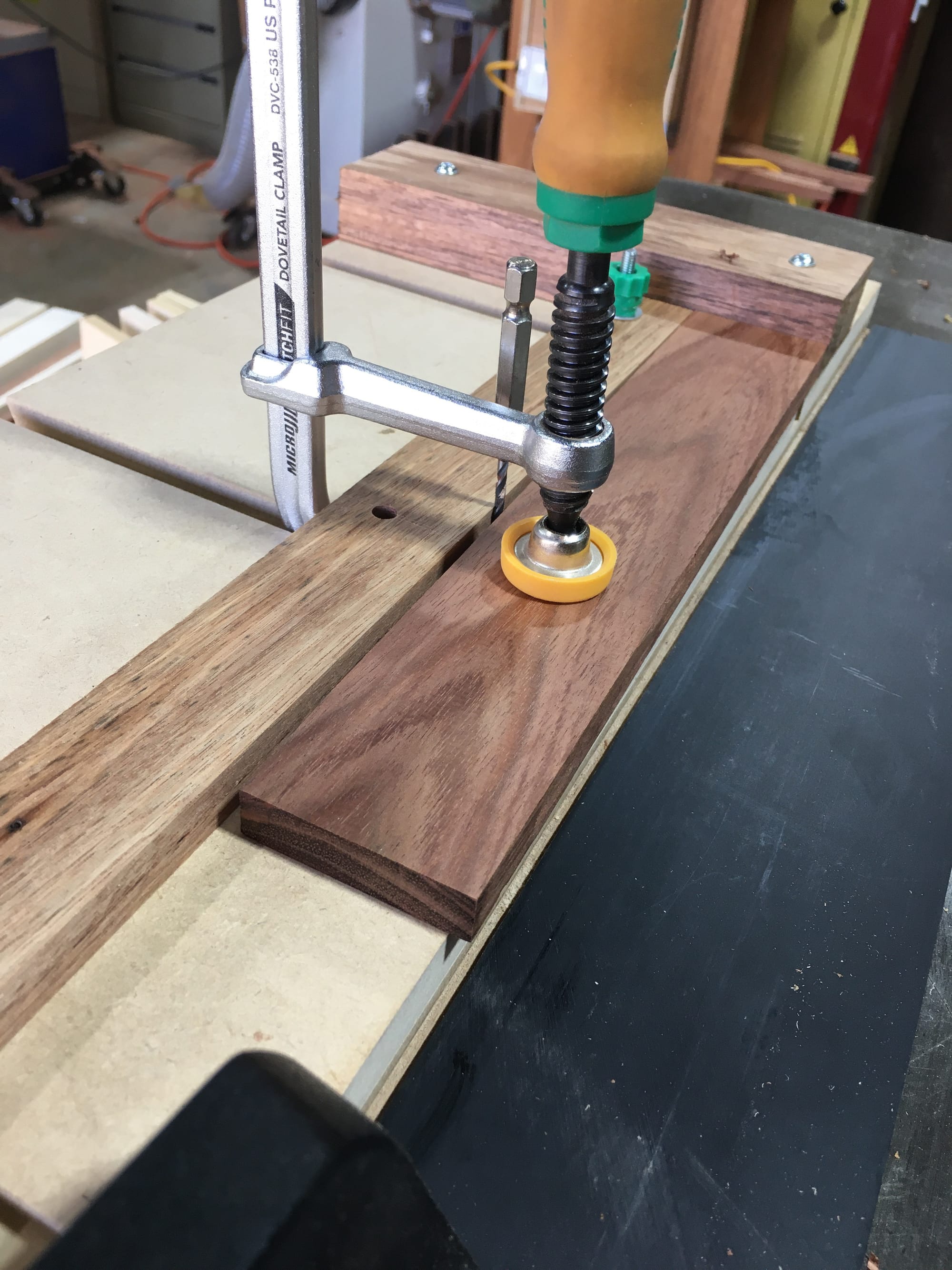 So I built a (long overdue) edge-grain shooting board and used it to make a nigh perfect 153:2 wedge. The wedge rides on the mitre shooting board and gives each spandrel the same nudge past 45. Because the same wedge works for both angles — uphill is one, downhill is the other — all eight faces will match. The shooting board also meant I could plane the spandrels to final length and width with a precision power tools can't touch. Hand tools are often slower; they're rarely less precise.