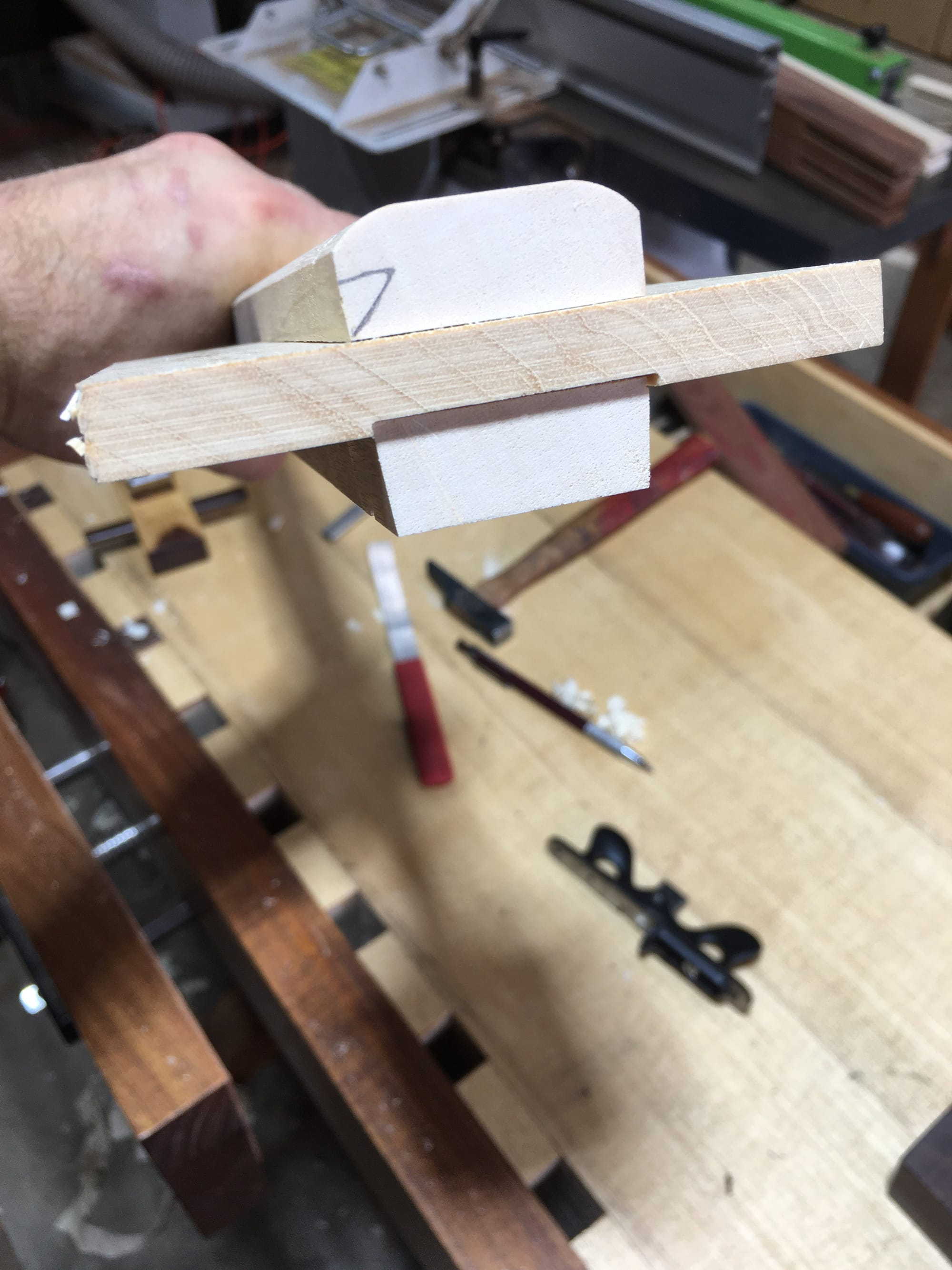 I cut the female dovetail slots in the spandrels before it occurred to me that the legs need to be fully finished - shaped, planed, sanded, carved - before fitting the male dovetail. Even a pass of 320 grit will take a perfect fit and make it sloppy. So I finished the legs and managed to get one fitted to its spandrel before Daddy Duties commenced. Figuring out the order of operations of this build has been tough. All the knowledge that was once passed orally is gone, so now all we can do is try and reverse engineer it (from a photograph... yikes) and hope that we don’t build ourselves into a corner.