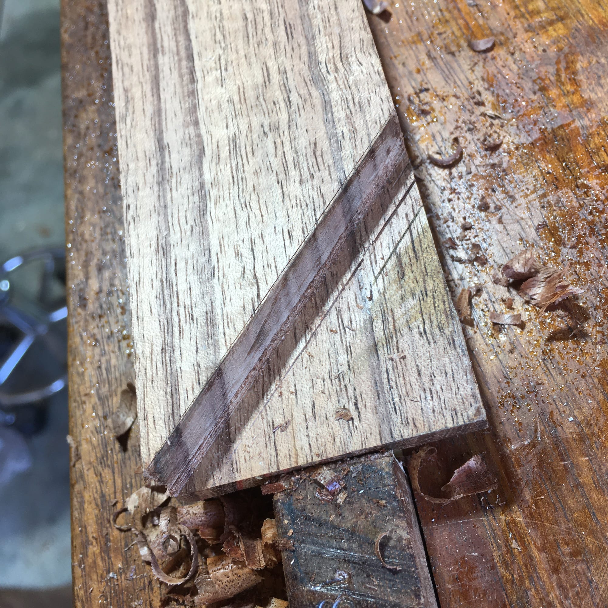 The mortise piece is straightforward: cut the mortise however you like, then cut the corner off at 45° and true it on the shooting board. The tenon is where the patience lives. Cheeks off with a dovetail saw, then a shoulder plane to bring the faces down to the gauge line. Don't go over it. Don't. You can't put it back, and if you go over it the baseline of the mortise will be in the wrong place and the corner won't close, the rail will be too short and the corner won't close to 90. So if you go over on one, you'll have to go over on the other side by the exact same amount. Better to just not go over.
