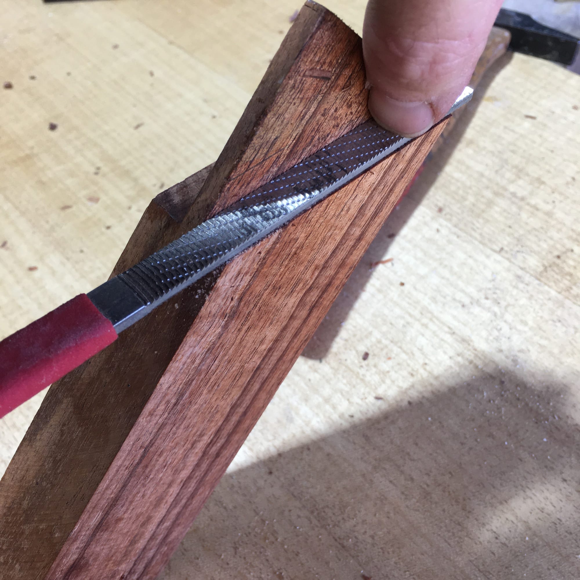 For final fitting: 1-2-3 block, sharp chisel, a spritz of camellia oil. When there's not enough meat left for the chisel to take a shaving, a plane maker's float — a rasp made of scrapers, tiny cuts, polished surface. Overkill for a tenon shoulder, but isn't this whole thing overkill?